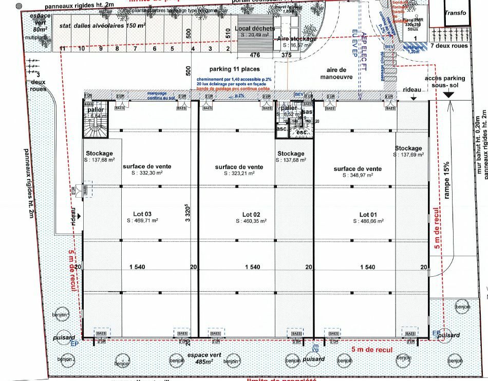 Ce bâtiment moderne est composé de 1460 m2 de commerces divisé en 3 lots + espace de stockage, et de 460 m2 de bureau.