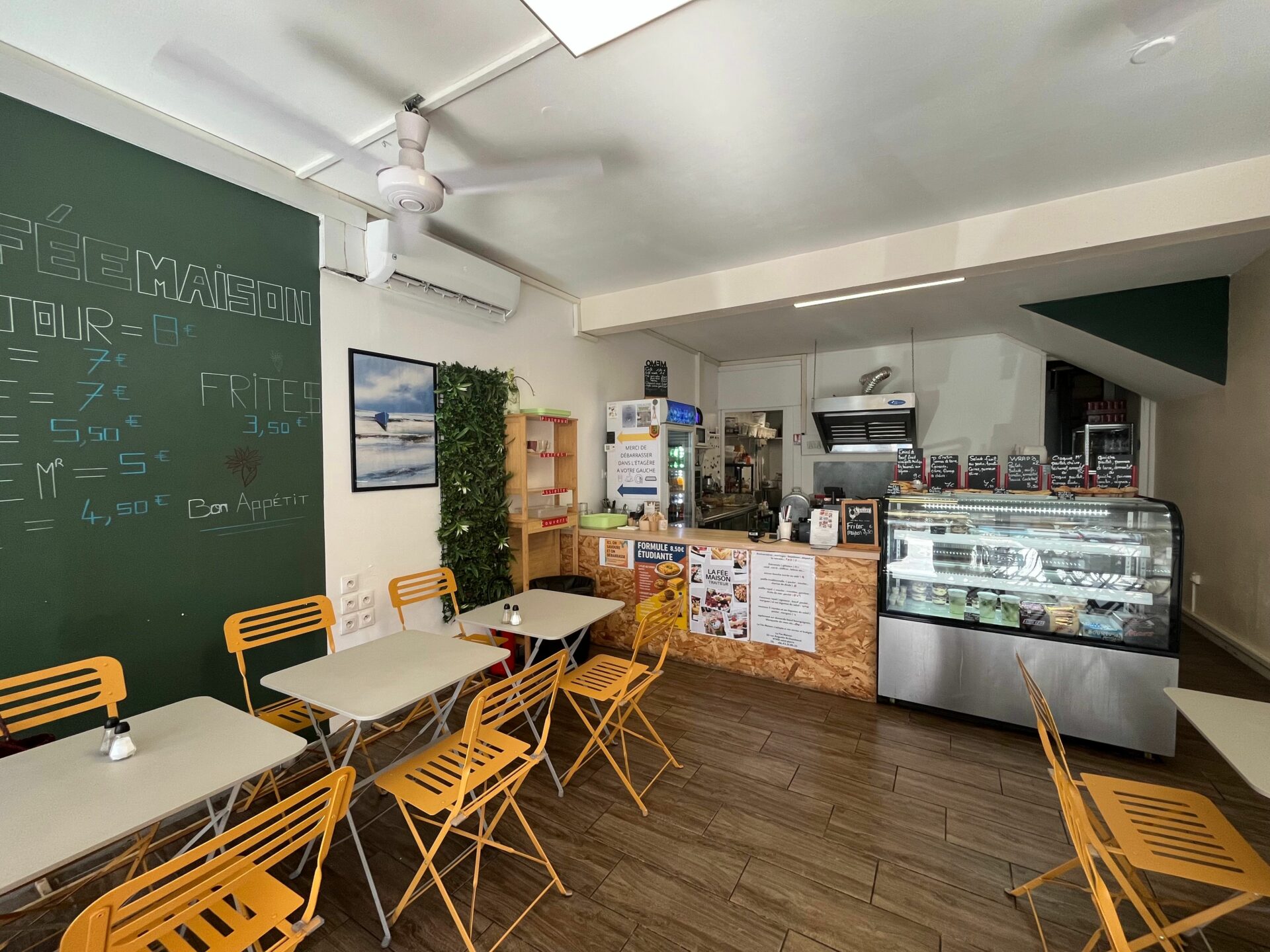 – une salle accueillante de 16 couverts, une cuisine fonctionnelle , une plonge avec un économat, et un wc . Une agréable terrasse de 8 couverts donnant sur rue.